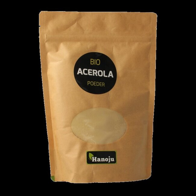 La poudre d'acérola bio Hanoju apporte 340 mg de vitamine C naturelle par dose journalière de 2 g pour soutenir l'énergie et le système immunitaire. Ce complément biologique est expédié sans plastique. Il convient à l'usage familial pour favoriser la vitalité et le bien-être.
