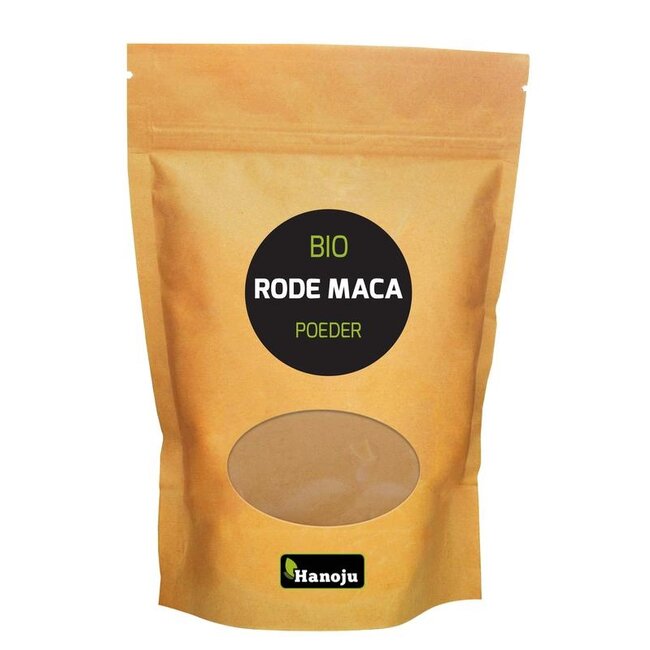 Poudre de maca rouge bio Hanoju. Complément alimentaire bio à base de poudre de racine de maca rouge.