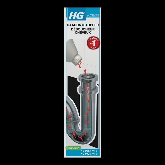 Informations de sécurité importantes : Transporter et conserver le carton à la verticale. Conserver les flacons toujours au frais, à l'abri de la lumière et en position verticale. Ne convient pas aux canalisations en aluminium et en zinc. Ce produit n'élimine pas les obstructions causées par des débris de construction, des objets métalliques, des lingettes de nettoyage, des serviettes hygiéniques ou d'autres matériaux non biodégradables. Si l'obstruction n'est pas causée par des cheveux et ne peut être éliminée avec ce produit, nous vous conseillons de consulter un plombier professionnel. Informez cette personne au préalable de l'utilisation de HG Déboucheur Cheveux, car le produit peut encore être présent dans les canalisations.