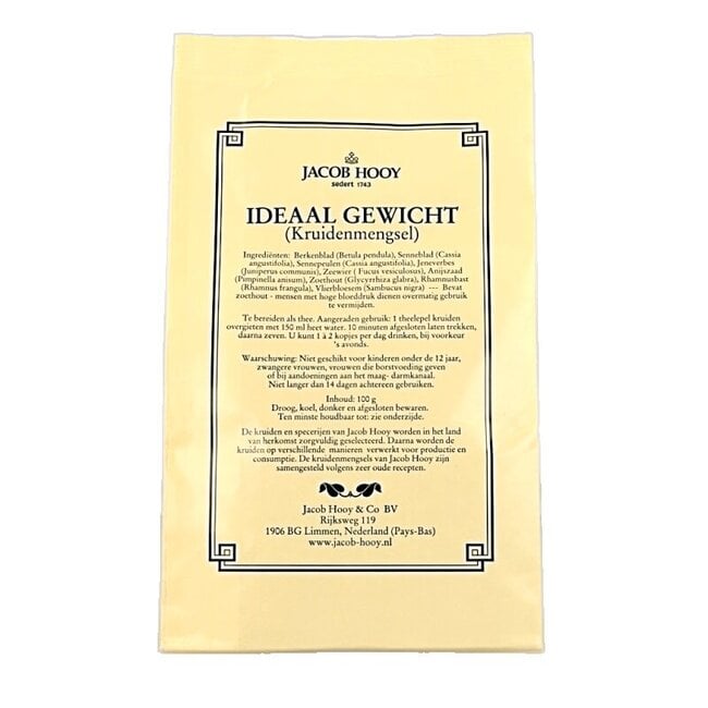 Pour une sensation de vitalité et un soutien naturel de votre poids idéal, choisissez la tisane Jacob Hooy Poids Idéal. Ce mélange de feuilles de bouleau, de séné et d'autres ingrédients vous aide à vous sentir plus à l'aise et plus équilibré. Un choix intelligent et fiable de VitAdvice – votre partenaire santé. Qualité supérieure à un prix juste.