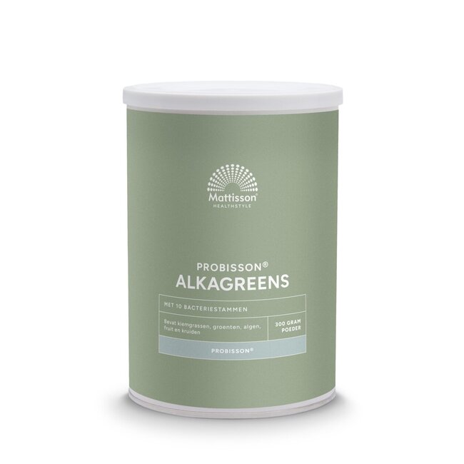 La poudre Mattisson Probisson AlkaGreens est composée, entre autres, de jeunes pousses d'herbes contenant de la chlorophylle, de fruits et légumes riches en fibres (VitaVeggieTM), d'un complexe de baies à indice ORAC élevé (VitaberryTM) ainsi que de prébiotiques et probiotiques (10 souches probiotiques différentes). Contient 0,1 milliard d'UFC* par gramme. *UFC : Unités Formant Colonie.