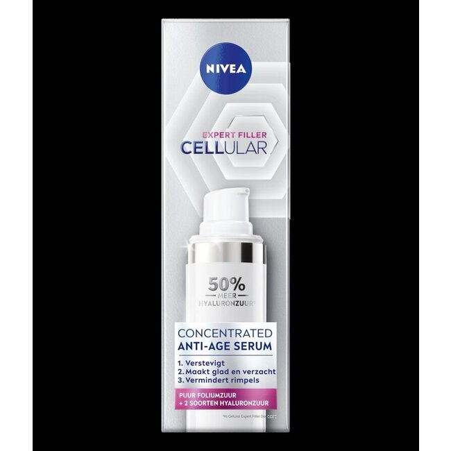 Souhaitez-vous une peau ferme et d'apparence plus jeune ? Le sérum Nivea Cellular Anti-Âge repulpe, raffermit et réduit visiblement les rides. Formulé avec de l'acide folique et 50 % d'acide hyaluronique en plus pour un effet immédiat. Votre choix responsable et sans plastique via VitAdvice : des soins de qualité supérieure pour toute la famille, toujours au meilleur prix. Faites confiance à votre partenaire santé.