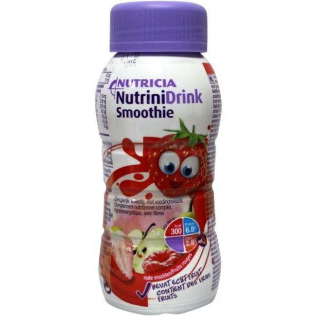 Nutricia NutriniDrink Smoothie est une alimentation liquide complète, hyperénergétique, avec des fibres alimentaires pour les enfants à partir de 1 an. Denrée alimentaire destinée à des fins médicales spéciales pour les besoins nutritionnels en cas de dénutrition associée à une maladie ou de retard de croissance. Contient de vrais fruits et 6 types de fibres alimentaires différents.