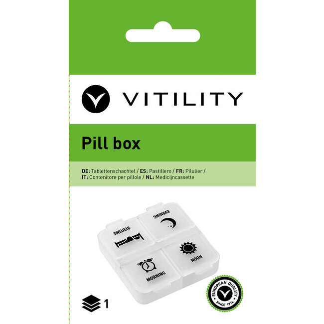 Une gestion organisée des médicaments pour toute la famille ? Le pilulier Vitility de VitAdvice (5,24 €) offre une vue d'ensemble claire. Quatre compartiments par jour pour une gestion sans effort. Économies intelligentes (jusqu'à 30 % d'avantage), approuvé par des experts et livré sans plastique. Votre choix pour le bien-être et la sérénité.