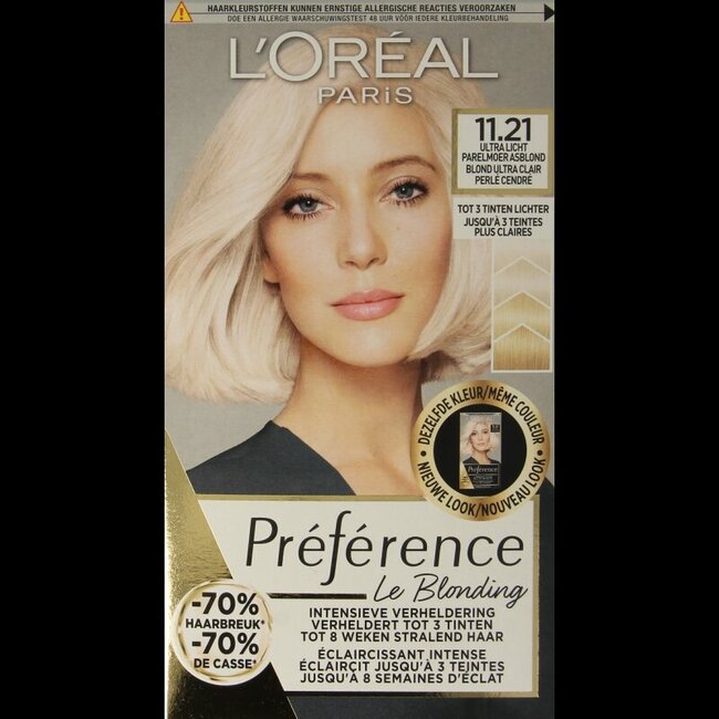 Vous souhaitez des cheveux plus clairs et éclatants ? L'Oréal Préférence 11.21 Blond Très Très Clair Perlé Cendré vous offre un look haut de gamme : jusqu'à 3 tons d'éclaircissement, une brillance intense et 70 % de casse en moins*. VitAdvice propose une qualité experte, souvent 30 % moins chère. Votre choix judicieux et sans plastique pour des cheveux pleins d'assurance, pour toute la famille. Découvrez la transformation !