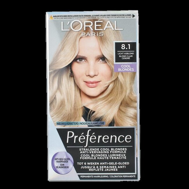 Découvrez L'Oréal Préférence 8.1 Copenhague Blond Clair Cendré. Cette formule gel unique, enrichie d'un système d'huile de brillance et de pigments réflecteurs de lumière, apporte à vos cheveux un éclat sublime et durable tout en sublimant vos nuances naturelles. Le masque violet anti-reflets jaunes inclus garantit un résultat blond cendré frais et froid sur le long terme.