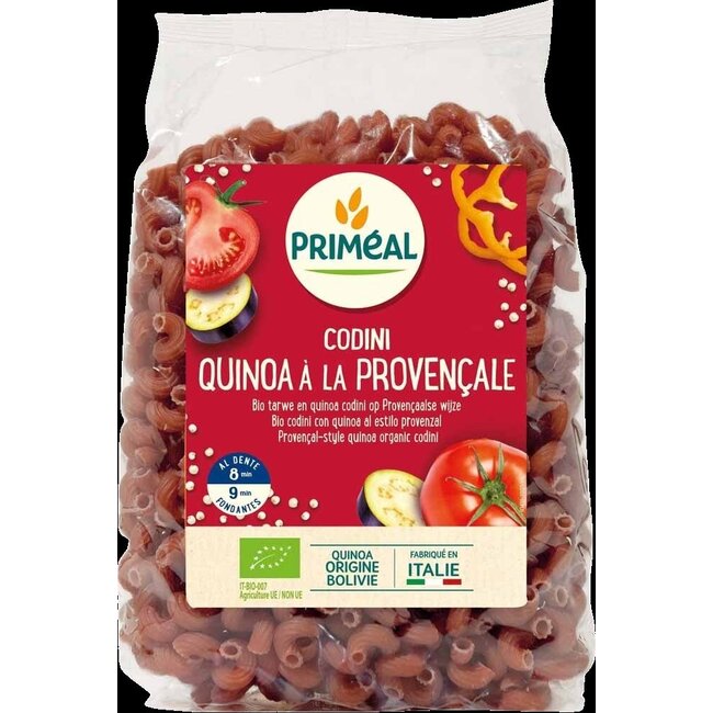 Les codini au blé et quinoa bio de Priméal se préparent en 8 à 9 minutes. Ce mélange de blé dur, de quinoa et de légumes biologiques constitue une solution nutritive. VitAdvice propose ce produit avec une expédition sans plastique.