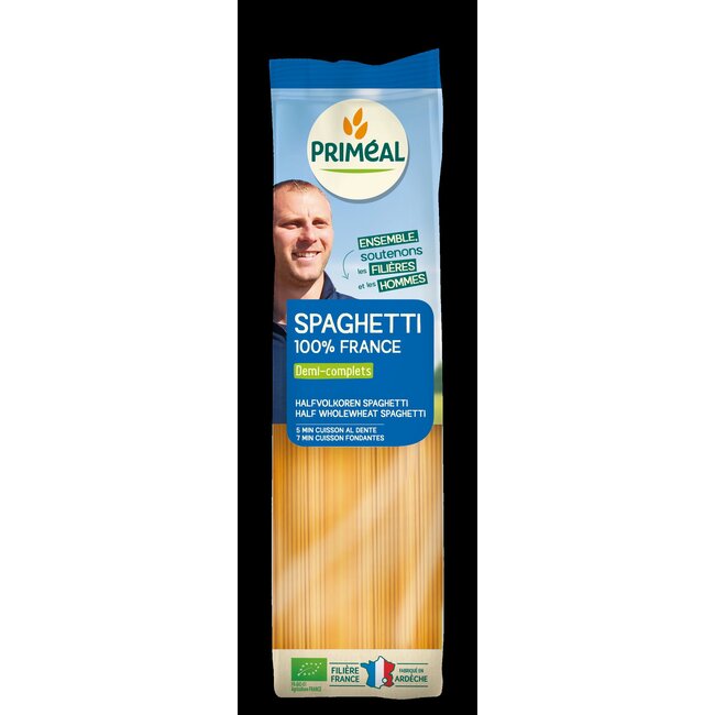 Les spaghetti demi-complet bio Primeal constituent une base nutritive pour les repas. Ce produit est riche en fibres et issu de l'agriculture biologique.