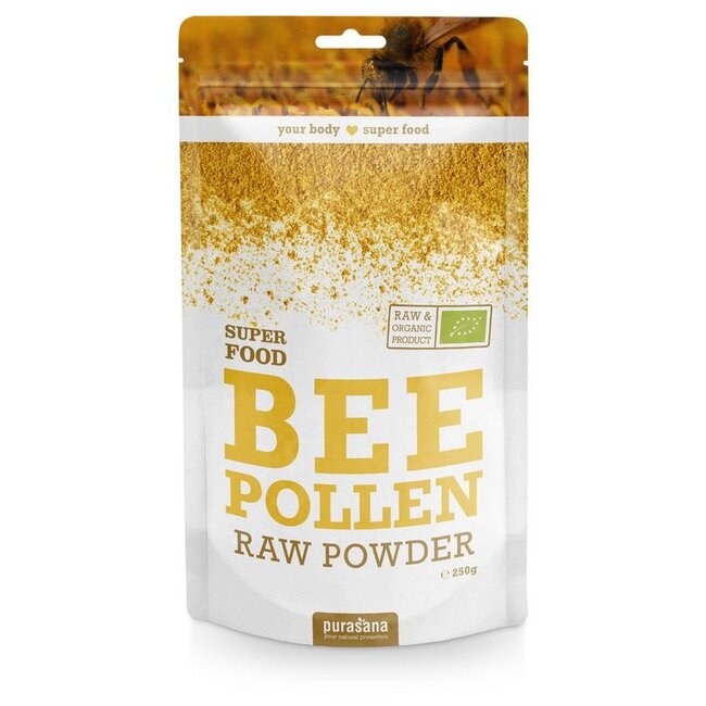 Le pollen d'abeille est constitué de grains de pollen collectés par les abeilles qui mélangent ces grains microscopiques avec leur nectar pour former de petites pelotes. Un maximum de 50 % du pollen est récolté à l'entrée de la ruche afin d'en laisser suffisamment pour la colonie d'abeilles elle-même. Le pollen Purasana provient d'Espagne et figure parmi les plus purs et qualitatifs en raison de l'abondance de fleurs sauvages dans les champs espagnols.