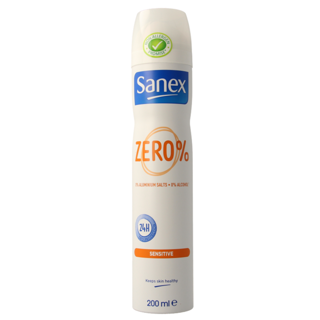 Le déodorant spray Sanex Zero % Sensitive protège la peau pendant 24 heures sans utiliser d'aluminium ni d'alcool. Sa formule contient de l'alun naturel pour permettre à la peau de respirer. Ce soin est destiné à un usage quotidien pour toute la famille.