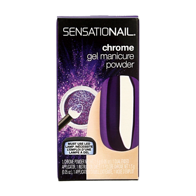 La poudre chrome violette Sensationail de VitAdvice permet de réaliser une finition chromée à effet miroir à domicile. Ce produit s'applique sur les ongles pour obtenir un aspect violet intense.