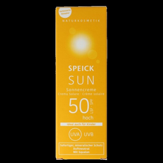 Profitez sereinement ! Speick Sun Crème solaire bio SPF 50 : protection minérale à absorption rapide pour le visage et le corps. Idéale pour petits et grands, y compris la peau des enfants, elle ne colle pas. Chez VitAdvice : qualité premium 30 % moins chère, expédition sans plastique, conseils d'experts. Choisissez une protection durable et sûre que votre famille mérite !
