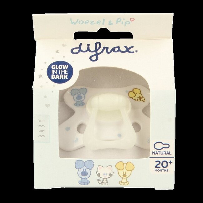 La sucette Difrax Woezel & Pip Natural 20+ mois Glow in the Dark est spécialement conçue pour les enfants à partir de 20 mois. La téterelle en silicone est plus ferme et plus remplie que celle de la sucette 12+ mois.