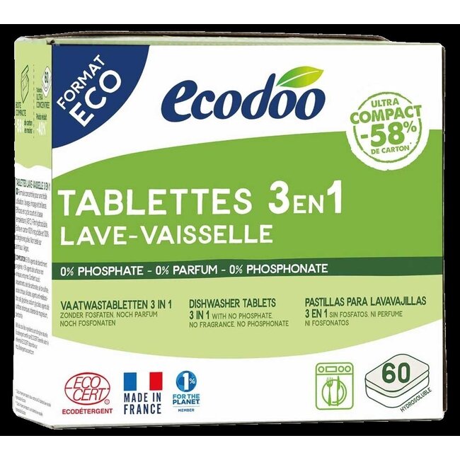 Vous souhaitez une vaisselle étincelante en toute sérénité ? Choisissez les tablettes lave-vaisselle 3-en-1 concentrées XL bio d'Ecodoo. Certifiées Ecocert, elles assurent un nettoyage, un rinçage et une brillance parfaits. Sans phosphates ni parfum, elles sont ultraconcentrées et compactes pour 60 lavages durables. Non testées sur les animaux, elles constituent un choix judicieux et responsable pour votre famille et l'environnement.