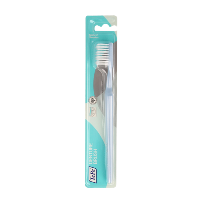 La brosse pour prothèses TePe : pour une prothèse parfaitement propre. Des poils longs et résistants assurent un nettoyage optimal, tandis que le manche robuste et pliable offre précision et prise en main.