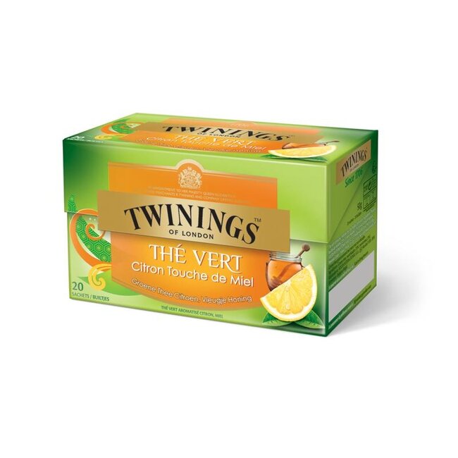 Thé vert Twinings citron et miel. Ce thé riche en saveurs invite à une pause gourmande. Doux, avec sa couleur caramel, il se marie parfaitement avec un gâteau moelleux, des choux à la crème ou des madeleines sortant du four. Chaque gorgée de ce thé tonifi