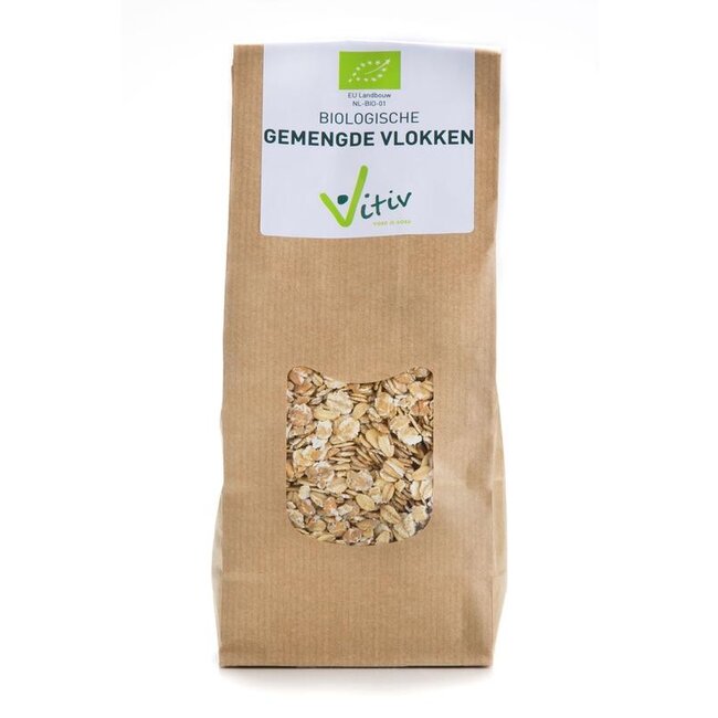 Un petit-déjeuner sain et abordable pour toute la famille. Le mélange de flocons bio Vitiv est riche en fibres. Ce mélange de blé, d'avoine et d'orge est pré-cuit à la vapeur et livré sans plastique. VitAdvice : votre partenaire pour le bien-être.