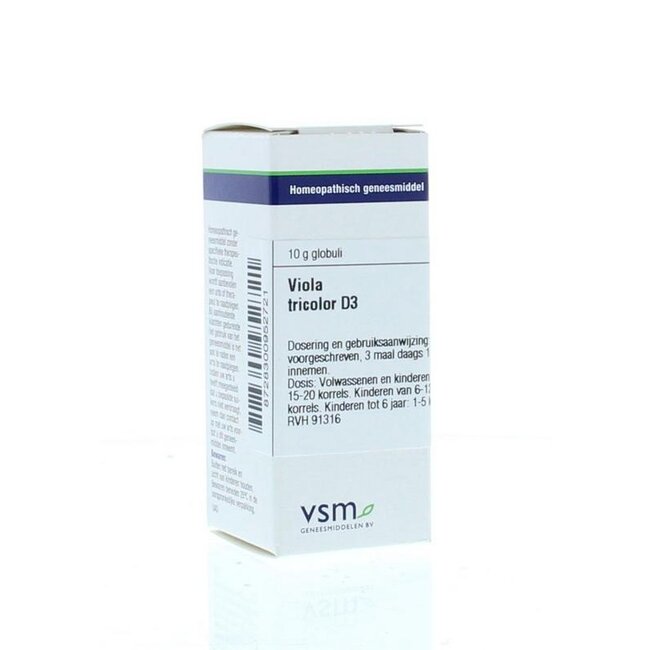 VSM Viola tricolor D3 est un médicament homéopathique sans indication thérapeutique spécifique, appliqué selon les principes de la médecine homéopathique. Il contient de la Viola tricolor D3 et du sucre de betterave (saccharose). Pour le dosage correct et le mode d'emploi – laisser fondre 1 dose dans la bouche 3 fois par jour (varie selon l'âge) – consultez toujours la notice. Lisez également les conseils de conservation et respectez la date limite...