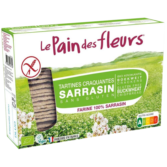 Grano saraceno con un pizzico di sale, nient'altro. Senza lievito, senza amido, senza altri cereali... I cracker Le Pain des Fleurs sono così seducenti proprio grazie alla loro semplicità. Questi cracker biologici a base di cereali non sono fritti nell'olio, a differenza di molti altri cracker. Sono garantiti senza glutine e quindi adatti anche a persone celiache o con intolleranza al glutine. I cracker sono una fonte di fibre e gli ingredienti provengono interamente da agricoltura biologica.