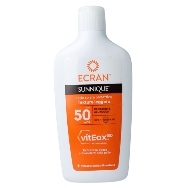 Latte Solare Ecran Sunique SPF50. Questo protettore solare contiene VitEox 80®, che protegge e rafforza le difese antiossidanti della pelle. Assicura un colorito dorato a lunga durata e rende la pelle morbida e idratata. Il latte è piacevole da spalmare e Per saperne di più.
