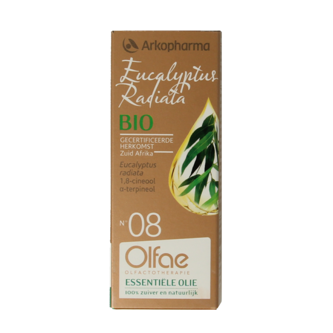 Questo olio essenziale Olfae Eucalipto radiata 08 bio è composto da olio essenziale biologico puro al 100% di foglie di Eucalipto (Eucalyptus radiata), Myrtaceae, proveniente dal Sudafrica.