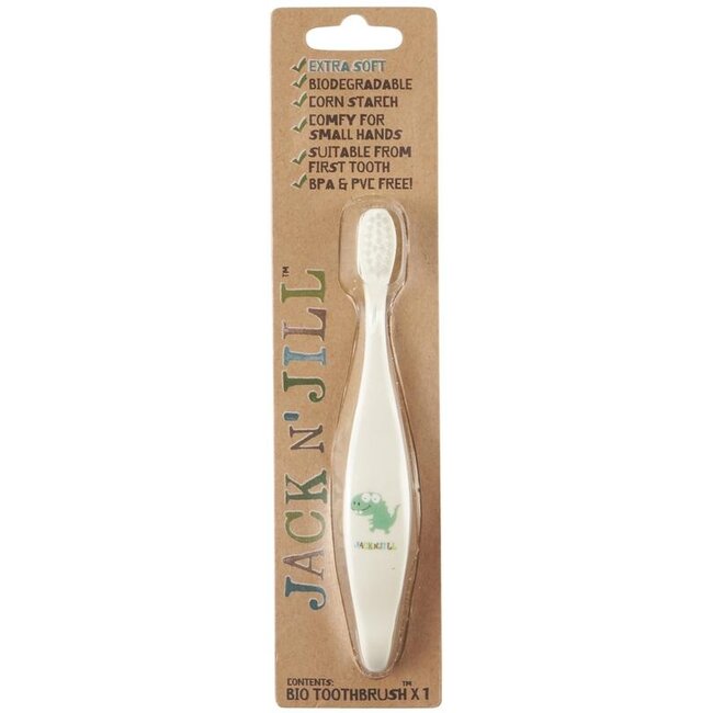 Regalate al vostro bambino un inizio sano! Questo Spazzolino Bio Jack N' Jill Dinosauro extra morbido, con manico in amido di mais al 100% e setole in nylon morbide, rende l'igiene orale divertente e sostenibile. Una scelta responsabile per sorrisi felici e un pianeta più pulito. Scoprite la cura intelligente e supportata da esperti per tutta la famiglia su VitAdvice, consegnata senza plastica e a un prezzo equo.