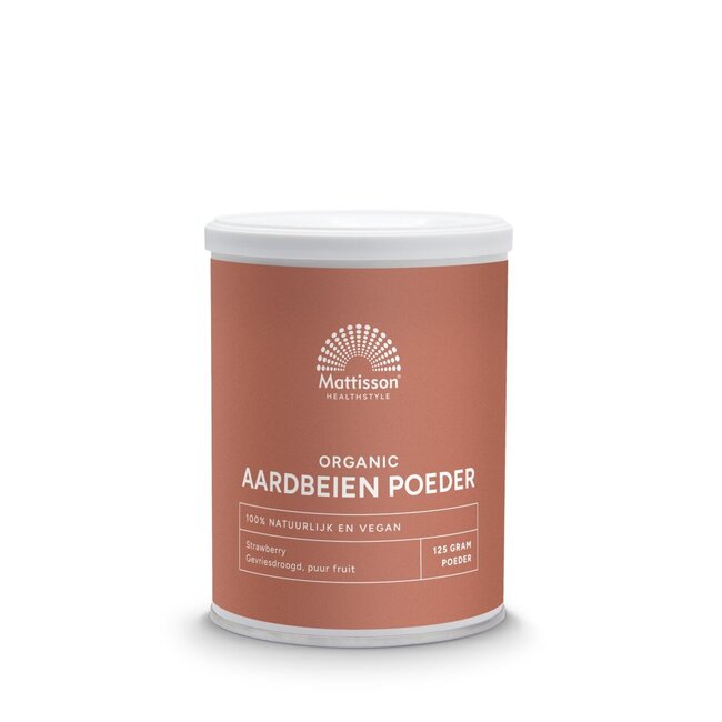 Aardbeien poeder bioMattisson biologisch aardbeienpoeder wordt gemaakt van zorgvuldig geteelde, zoete aardbeien. Door deze biologische aardbeien te vriesdrogen en vervolgens te vermalen tot een fijn poeder, blijven alle natuurlijke voedingsstoffen behouden. Dankzij het vriesdroogproces kun je het hele jaar door genieten van de pure, zoete en fruitige smaak van aardbeien.