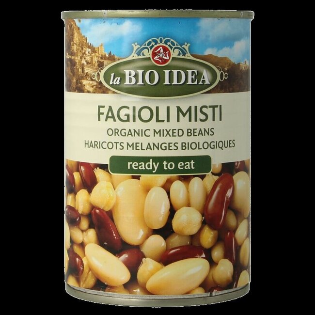 water, rode kidneybonen*(15%), kikkererwten* (15%), witte boontjes* (15%), boterbonen* (15%), zeezout. *van biologische afkomst