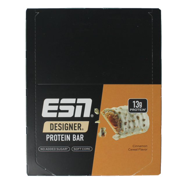 Cinnamon cereal bar 45gReep met 31% eiwit met 35% witte chocolade omhulsel met zoetstoffen, 12% kaneel-koekje-gearomatiseerd vulling en 6% stukjes koek. Met zoetstoffen