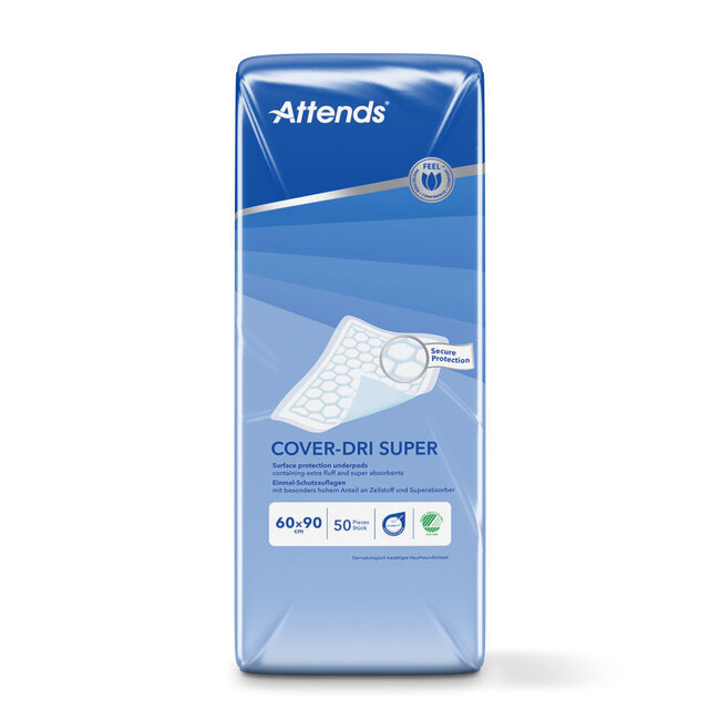 Attends Cover-Dri Super zijn oppervlakte beschermende onderleggers, speciaal ontworpen voor lichte tot matige urine-incontinentie. Cover-Dri heeft een patroon van zeshoekige kussentjes, die fluff en superabsorberende bestanddelen bevatten. Vocht wordt hierdoor snel geabsorbeerd en ingesloten. De tussenliggende kanalen verdelen het vocht snel, zonder dat het zich op één plaats ophoopt. De anti-lekrand rondom het product helpt lekkage te voorkomen. Een lichtblauwe waterdichte onderkant zorgt ervoor dat de onderlegger op zijn plaats blijft.