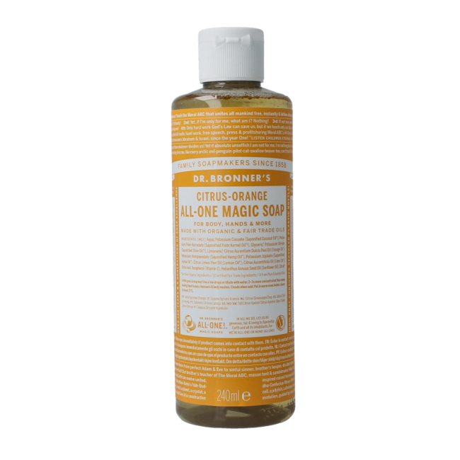 Ervaar écht pure Dr. Bronner's citrus vloeibare zeep. Deze 100% natuurlijke formule, vrij van synthetische stoffen, verzorgt uw huid en die van uw gezin mild en effectief. Geniet van de kalmerende geur van biologische essentiële oliën. Een slimme, verantwoorde keuze voor dagelijkse wellness, nu 30% voordeliger.
