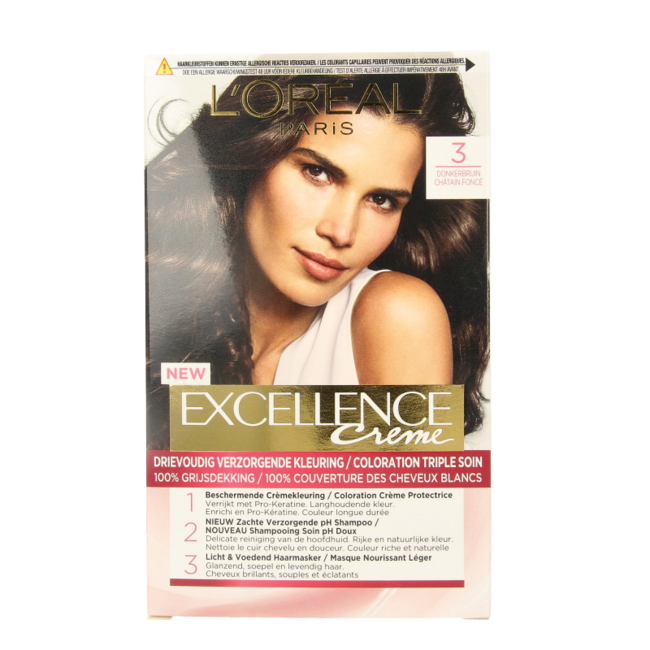 Moe van dof of grijs haar? Loreal Excellence 3 Donkerbruin geeft 100% grijsdekking en een rijke, langhoudende kleur. De unieke drievoudige verzorging beschermt en voedt uw haar. Voor een glanzend, gezond aanvoelend resultaat thuis, een slimme en bewuste keuze. Voel u zelfverzekerd, elke dag!
