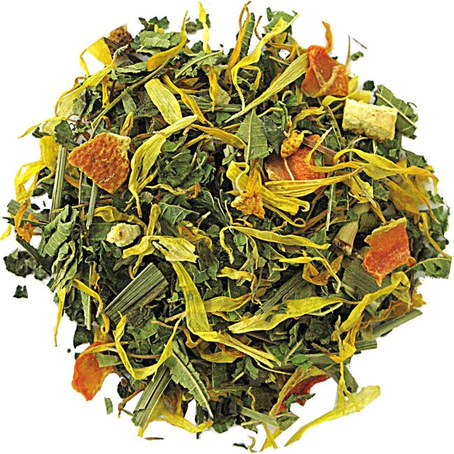 Verbeneblad, melisseblad, citrusschil, aardbeiblad, lemongrass, wortel (peen), goudsbloembloesem, natuurlijk citroenaroma, aroma.