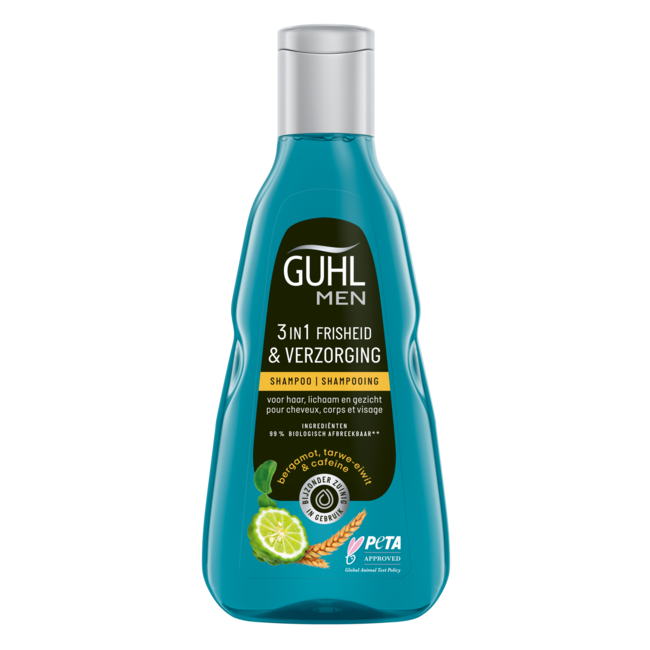 Guhl Man 3-in-1 Frisheid & Verzorging: jouw slimme, efficiënte persoonlijke verzorging. Ervaar directe frisheid, vitaliteit én hydratatie voor haar, lichaam & gezicht met bergamot en cafeïne. Deze vegan formule, dermatologisch getest en in een 99% gerecyclede flacon, garandeert topkwaliteit en duurzaamheid. VitAdvice biedt deze shampoo eerlijk geprijsd en plasticvrij geleverd. Jouw bewuste, comfortabele keuze voor het hele gezin. Voel je elke dag energiek en vol zelfvertrouwen!