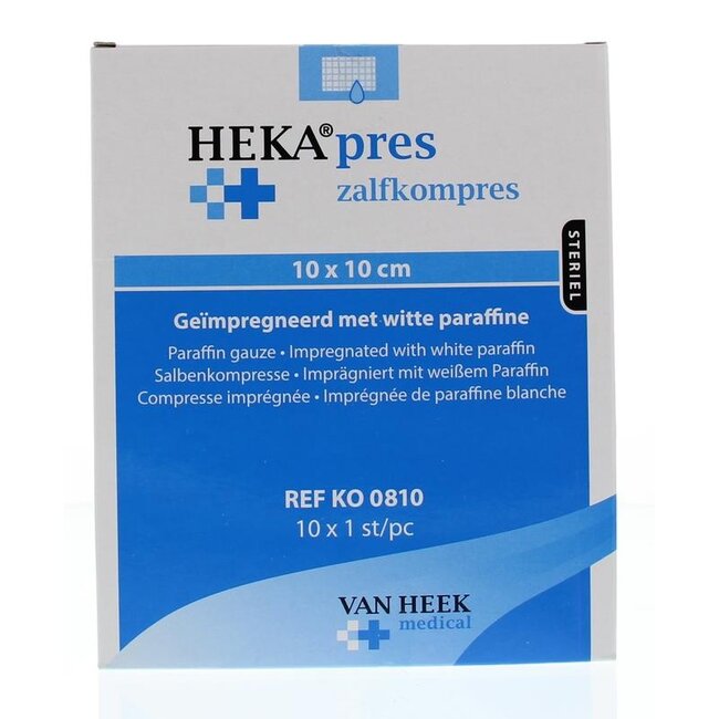 Het HEKA pres zalfkompres is een niet-verklevend grofmazig katoenkompres, geïmpregneerd met paraffine.