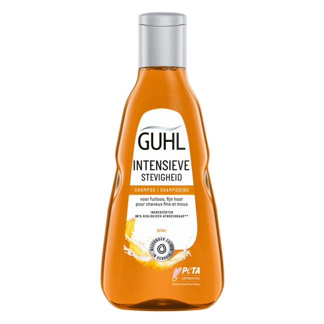 Transformeer futloos, fijn haar naar voelbaar sterker en voller. Deze Guhl shampoo, met expert-backed, vegan formule en bier, vermindert haarbreuk. Een bewuste keuze, 99% gerecycled plastic.