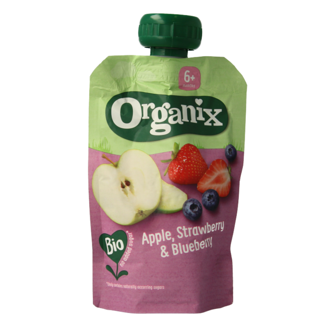 Een lekker 100% biologisch Organix fruithapje met appel, aardbei en bosbes in een handig knijpzakje. Het perfecte tussendoortje en ideale babyvoeding voor je baby of peuter!