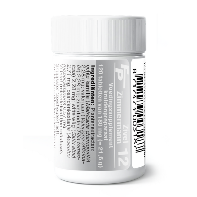 IngrediëntenEchte kamille (matricaria chamomilla), valeriaan (valeriana officinalis), zilverlinde (tilia tomentosa), witte wilg (salix alba), paardekastanje (aesculus hippocastanum), vulstof (microkristallijne cellulose), anti-klonter-middelen (stearinezuur, siliciumdioxide), smaakstof (zoethout extract), magnesiumstearaat