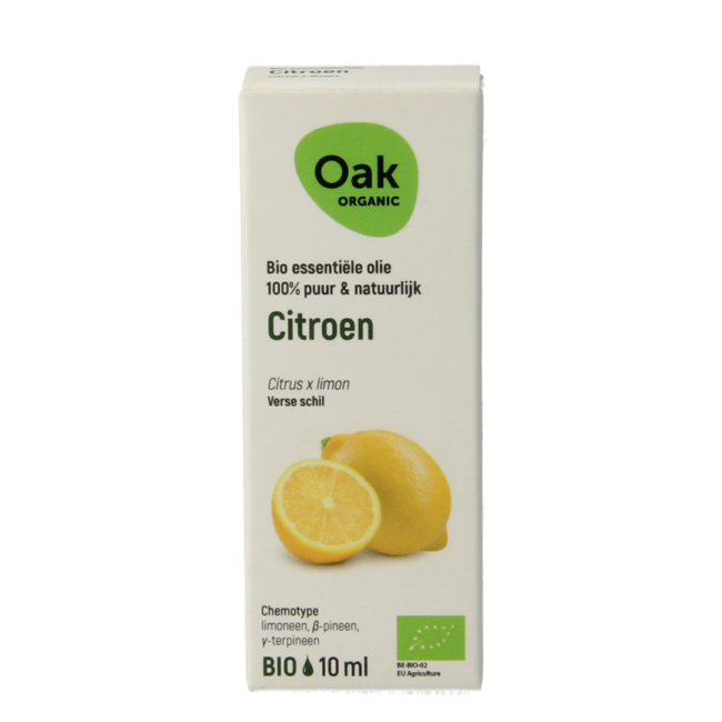 Oak Citroen bioDe essentiële olie van citroen is niet meer weg te denken uit vele dagelijkse aspecten van ons leven. Het is te vinden in voeding, dranken, huishoudproducten (vaatwasmiddel), cosmetica, parfums, Eau de Cologne,… Het verhoogt de opwekkende of relaxerende (afhankelijk van de synergie) werking van massagerecepten.