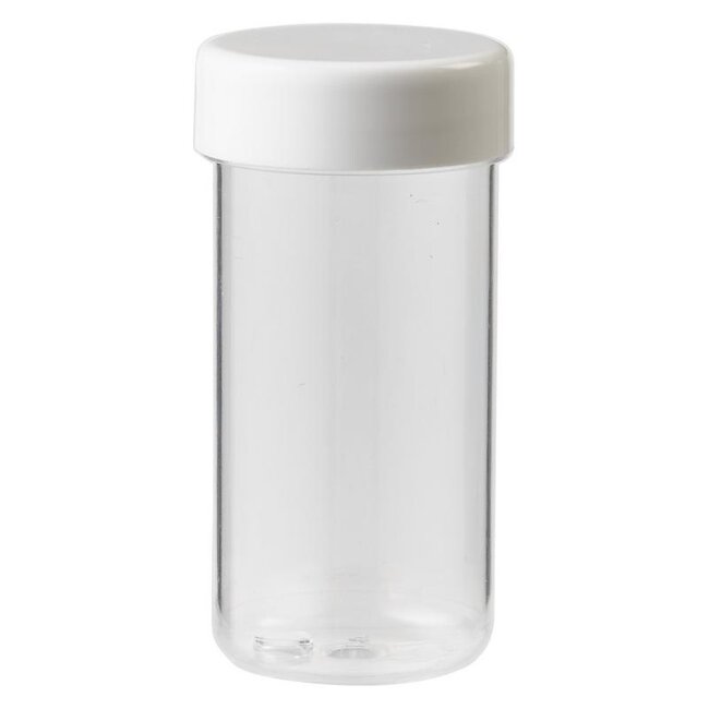 Plastobel pot geproduceerd van het materiaal PS (polystyreen) transparant met opgeschroefde gladde PP dop (Polypropyleen) Geschikt voor verpakken van o.a. tabletten, dragees en capsules.