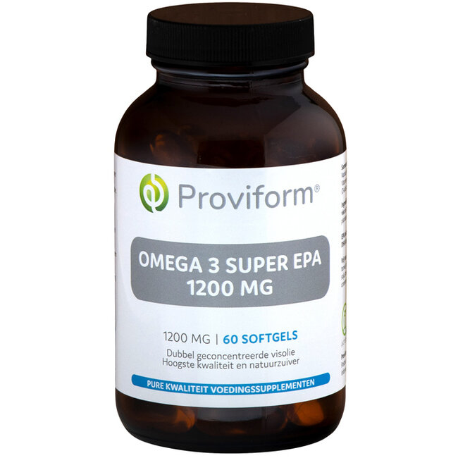 Proviform Omega 3 super EPA 1200 mgNatuurzuivere visolie met 360 mg EPA en 240 mg DHA per softgel. Aan glycerol gebonden visolie voor een betere opname. Softgel capsules van visgelatine. Moleculair gedistilleerd voor een gegarandeerde zuiverheid.
