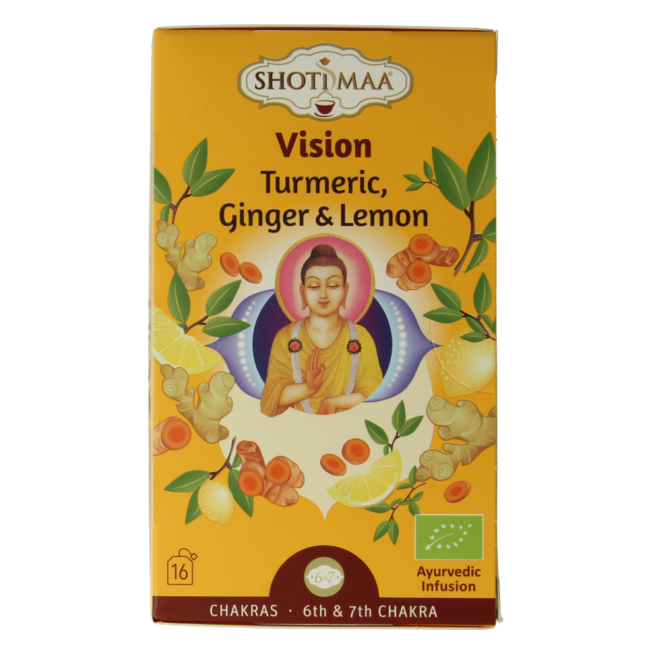 Kurkuma* (50%), gember* (19%), citroengras*, zoethoutwortel*, zwarte peper*, citroensap* (3%), pepermunt*, kaneel*, citroen mirte*, citroenverbena*, citroenschil* (1%), citroenextract*, kardemom*, kruidnagel*.