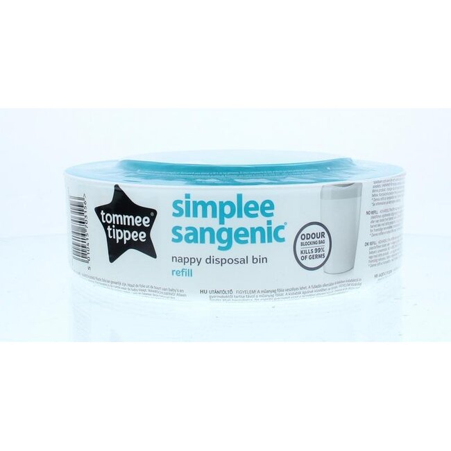 Tommee Tippee Simplee sangenic cassettes Navullingen voor de Simplee Sangenic luieremmer. Met de Simplee Sangenic luieremmer/ toiletemmer van Tommee Tippee verpak je luiers en alle intieme afvalmateriaal geurvrij. De Simplee werkt veilig, gemakkelijk en simpel: open het deksel, duw het afval door een scharnierende klep en sluit het deksel; uit het zicht en het belangrijkste geen nare geurtjes meer. Deze toiletemmer verpakt met behulp van een (navul)cassette met verpakkingsmateriaal luiers en persoonlijke hygiëne afval als maandverband, tampons, stomazakjes, inleggers etc etc. in een bacteriedodende folie.