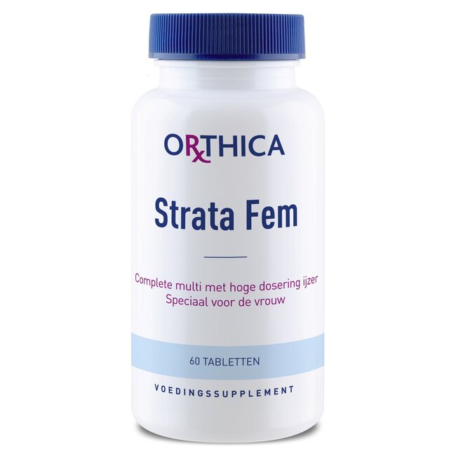 Strata Fem is hoog in ijzer, ijzer is goed voor de normale vorming van rode bloedcellen en hemoglobine. Door vitamine B2, B3, B5 en B6 draagt de multi bij tot vermindering van moeheid Waarbij B6 ook bijdraagt aan de regulering van de hormonale activiteit. Verder zijn selenium en zink goed voor haar en nagels, en zorgen selenium, biotine, koper en zink voor het behoud van glanzend haar. Het aanwezige biotine ondersteunt het herstellend vermogen van de huid, en vitamine C ondersteunt de vorming van collageen voor een normale huid. Met druivenpitextract en groene thee-extract.