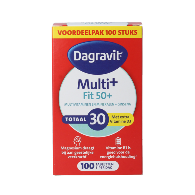 Dagravit Totaal 30 Vitaal 50+Dagravit Fit 50+ multivitaminen is speciaal samengesteld voor de vijftigplusser en is een voedingssupplement in de vorm van tabletten. Als aanvulling op je dagelijkse voeding bevat dit product vitaminen, mineralen zoals calcium, planten zoals ginseng.