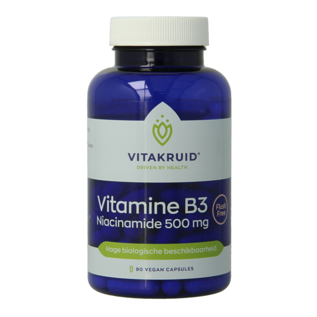 Vitakruid Vitamine B3 Niacinamide 500 mg Flush FreeVitamine B3 speelt een belangrijke rol bij de productie van 2 co-enzymen in het lichaam: NAD (Coënzym 1) en NADP (coënzym 11). Deze enzymen zijn betrokken bij meer dan 200 biochemische reacties in het lichaam. Deze vitamine wordt in beperkte mate gevormd uit tryptofaan.