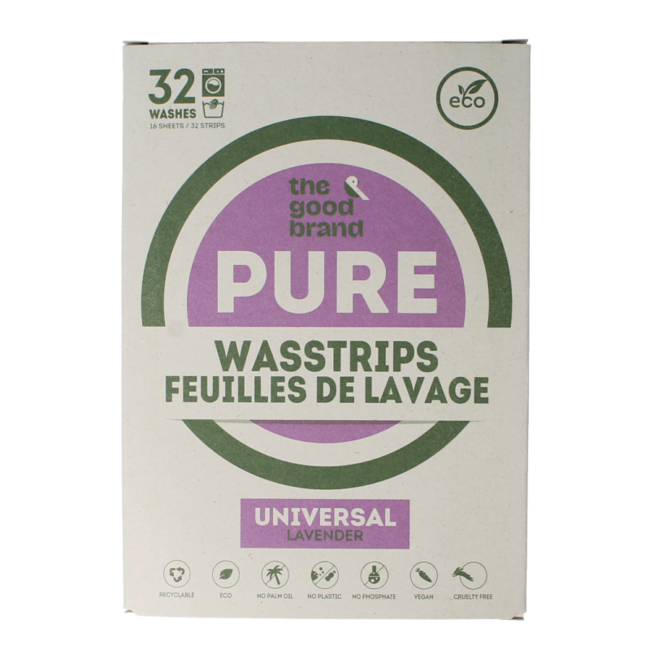 The Good Brand Listki do prania lawenda Czyste listki do prania uniwersalne lawenda na 32 prania. Do prania ręcznego i w pralce. Ekologiczny, łatwy w użyciu i oszczędzający miejsce środek do prania. Odpowiedni dla niemowląt i skóry wrażliwej, hipoalergiczny, antybakteryjny, wolny od parabenów.