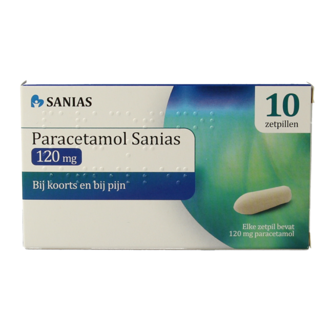 Sanias Paracetamol 120 mg, RVG 57797 AV. Ten środek jest lekiem przeciwbólowym i przeciwgorączkowym. Stosuje się go w przypadku bólu głowy, bólu zębów, bólu mięśni, lumbago (postrzału), bólu nerwów, bólu menstruacyjnego, gorączki i bólu towarzyszącego grypie, przeziębieniu lub po szczepieniu.